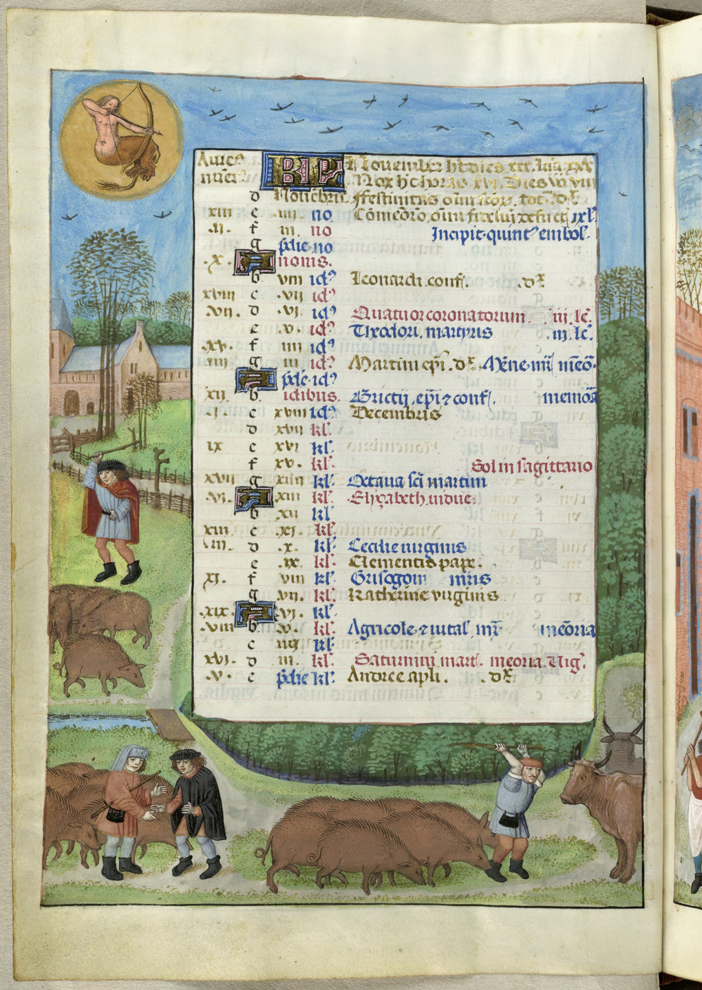 The British Library, Isabella Breviary. Additional 18851, f. 6v: calendar page for November. The pigs are on their way to market. I think something bad is going to happen to them, also to the cows on the right. I like the way the tall tree in front of the church just has a few leaves left. Mine looks like that too.